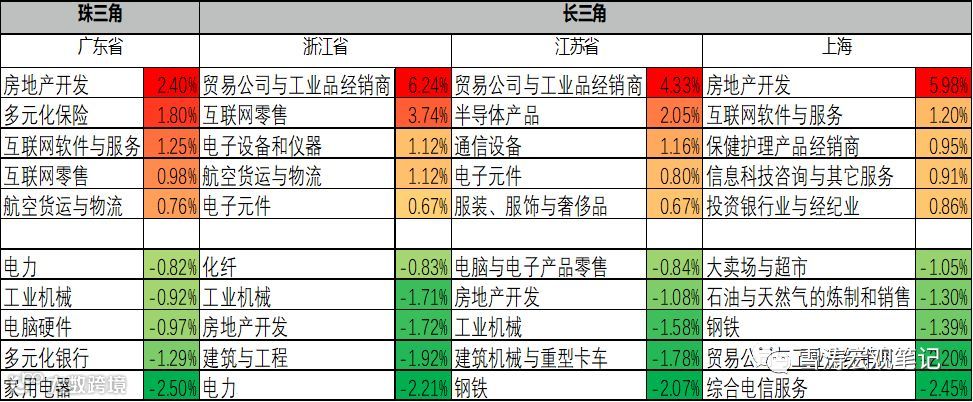过去三年,广东占比上升最快的行业是房地产、保险、互联网,下降最快的是家电。长三角地区上升最快的是贸易、互联网、房地产,下降的是建筑工程、机械、钢铁等重资产传统行业。综合来看,珠三角(广东)由制造业向多元服务业转型的特征明显。长三角地区(江浙沪)的产业链完备,依托沿海优势,发展贸易、精密制造(电子设备、电子元件、通信设备、半导体)、汽车制造等多元产业,同时诞生了阿里苏宁等线上线下的零售巨头。上海作为全国金融中心,承担了长三角地区发展金融、地产、健康、电信等高端服务业的功能。