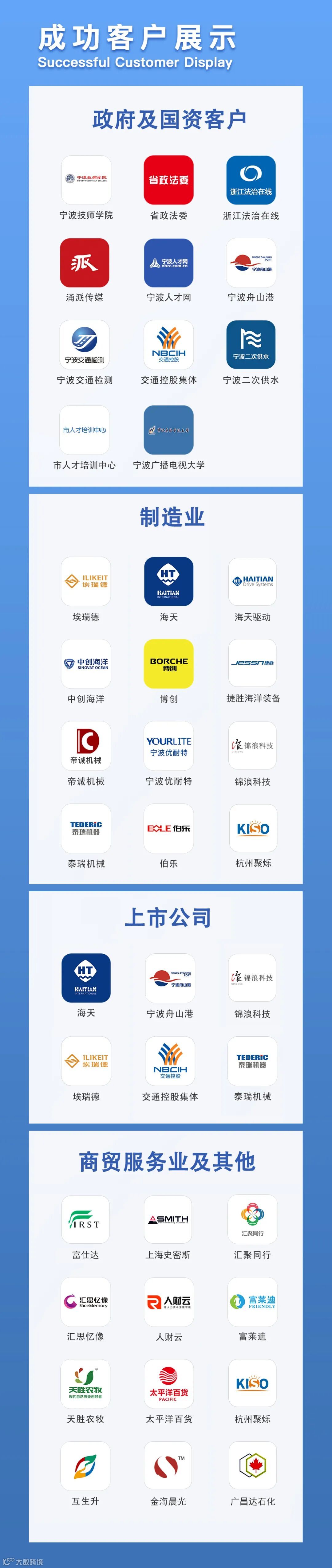 迄今,公司的产业互联网平台服务于国家渔业创新联盟、宁波舟山港、中国海天集团、泰瑞机器、博创装备、帝诚机械、伯乐塑机、宁波自来水等数百家政企单位,有效促进企业数字化变革。