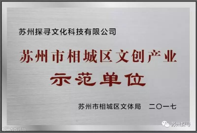 我司获得苏州市相城区文创产业示范单位称号。示范单位称号可提升我司无形资产价值和公信力;增强企业管理水平和核心竞争力,树立良好的企业形象和品牌知名度;得到各级政府、市场主体和社会大众的权威认可,获得政府主管部门的优惠政策支持;在同等条件下取得优先合作权,从而得到更多合作机会,在同行业中起到模范标杆作用。这些都是探寻人共同创造的结果,也是政府对我们的肯定,在此,我们承诺将继续在探索研发新技术新服务的道路上勇往直前!