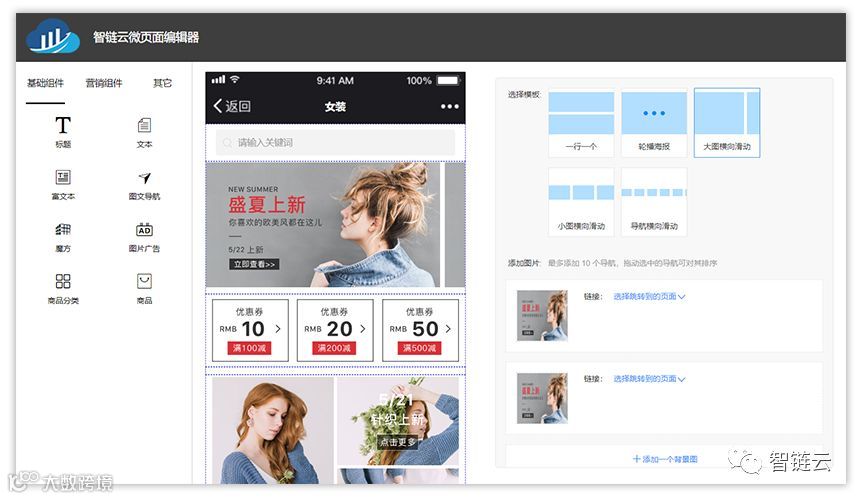 本次云站系统升级参考云推系统的编辑方式,支持可视化编辑,左边拖拉模块右边显示最终呈现效果,让店铺装修更便捷!