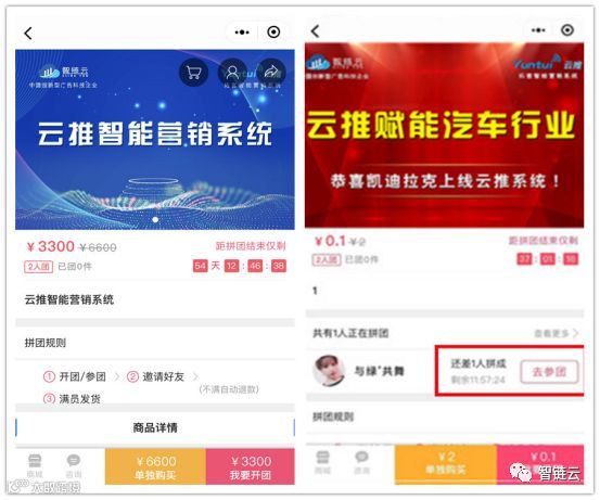 功能:拼团功能,客户主动分享转发,客户数量翻倍。