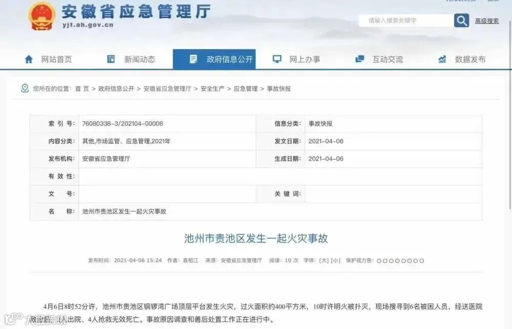 2021年4月6日,安徽省池州市铜锣湾商场顶层平台发生较大火灾事故,造成4人死亡、2人受伤。据了解,其中3名死者在疏散逃生过程中返回火场收拾财物,错失最佳逃生时机。