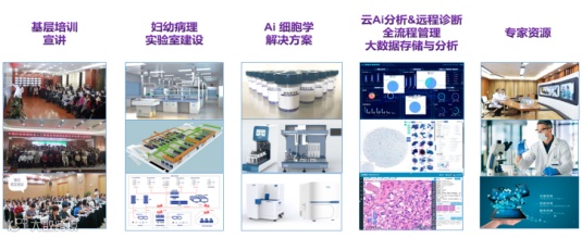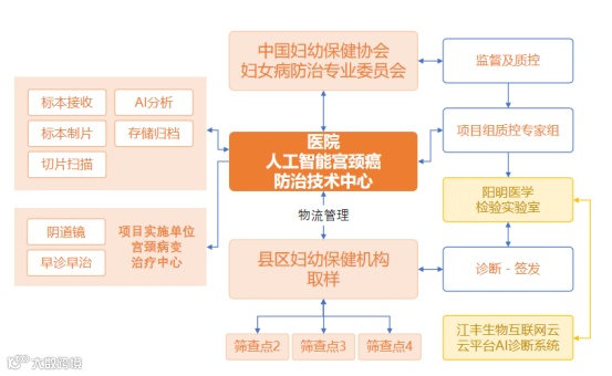 该项目在市级妇幼保健院建立筛查实验室,各基层(县、市、区)设置采样点,通过物流配送全市的样本至中心,中心完成制片后应用Ai筛查系统进行初筛,并由病理专家团队进行在线复核,完成标准、高效、优质的宫颈癌筛查工作,样本通过集中化的标准处理,解决基层技术参差不齐的现状。通过在线Ai分析提升整个诊断过程的效率,再通过全流程业务的信息化管理形成整个筛查过程的精细管理和追溯。整套方案所需制片试剂耗材、设备、数字扫描、人工智能分析均由江丰生物自主研发生产。