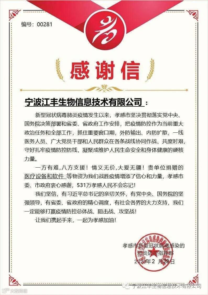 当前,社会各界万众一心抗击疫情。为进一步助力湖北新冠肺炎治疗工作,2月15日,宁波江丰生物信息技术有限公司主动承担社会责任,迅速行动,积极联系、协调多方资源,发挥企业优势,在物流不便的情况下,克服重重困难,向孝感市中心医院定点捐赠医疗设备及远程会诊平台,支援孝感市抗击新冠肺炎疫情。