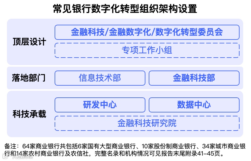 根据 InfoQ 研究中心不完全统计,64 家商业银行中,共有 44 家设置了专门的数字化转型委员会,60 家在总行层面设置了数字化转型部门,26 家设立了研发或数据中心,21 家成立了单独的金融科技子公司。