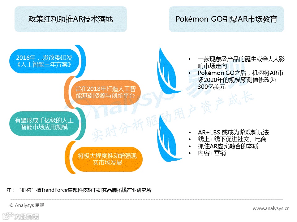 2016年,有两个信号利好增强现实市场。第一,人工智能技术被提升至国家政策层面,这将极大推动增强现实技术落地;第二,一款名为Pokémon GO的AR+LBS游戏火遍全球,加速了增强现实的市场教育。