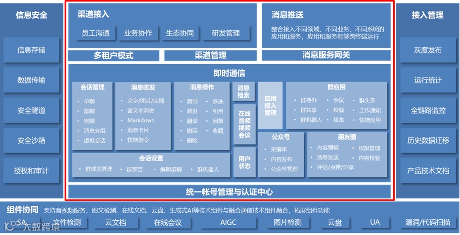 功能逻辑统⼀:不同业务线的沟通模式可能不同,但底层的功能逻辑需要⼀致。例如,跨部⻔协作时,应当有统⼀的⾝份认证、权限管理、消息收发交互、消息存储策略等。 -