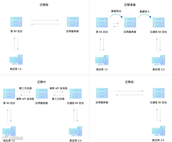 强制升级:完成即时通信 IM 服务端数据同步后 ,强制 App 从 1.0 升级为 2.0,此⽅案实施简单 ,升级后⽆需处理新⽼ App 兼容问题。