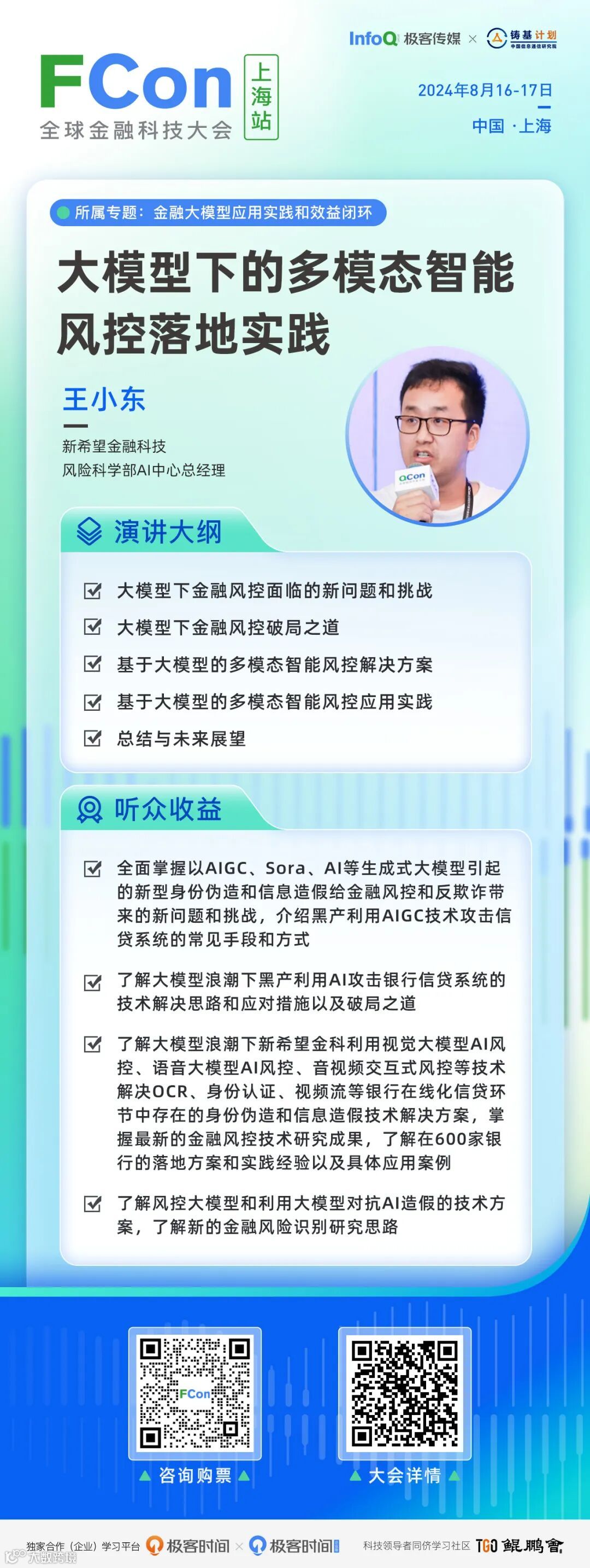 8 月 16-17 日,FCon 全球金融科技大会将在上海举办。本届大会由中国信通院铸基计划作为官方合作机构,致力于展示金融数字化在“十四五”期间的关键进展,以及近一年多来金融领域的 AI 大模型落地实践。大会邀请了来自工商银行、交通银行、华夏银行、北京银行、广发银行、中信银行、平安证券、华泰证券、度小满、蚂蚁集团等金融机构及金融科技公司的资深专家,现身说法分享其在金融科技应用实践中的经验与深入洞察。大会火热报名中,详情可联系票务经理 17310043226 咨询。