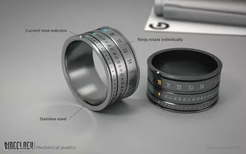 由Gusztav Szikszai 设计的戒指,采用医用不锈钢材质制作,时钟拥有三个旋转环,分别代表小时、分钟和秒钟,在旋转的时候,内置的LED会点亮对应的符号。把它放在操控台上即可无线充电与调整时间。目前,戒指时钟正在Indiegogo上募集资金。