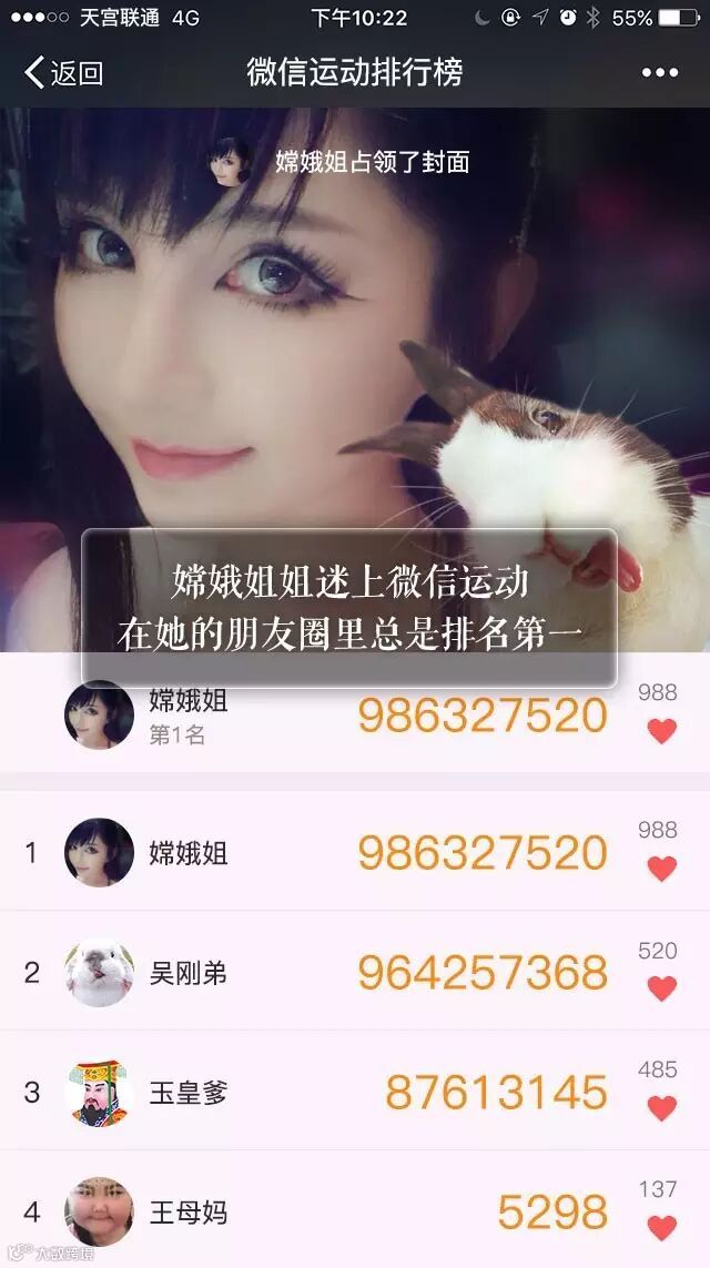 这样,嫦娥真正成了运动圈的红人,每天获得点赞就更多,也是越发有动力。