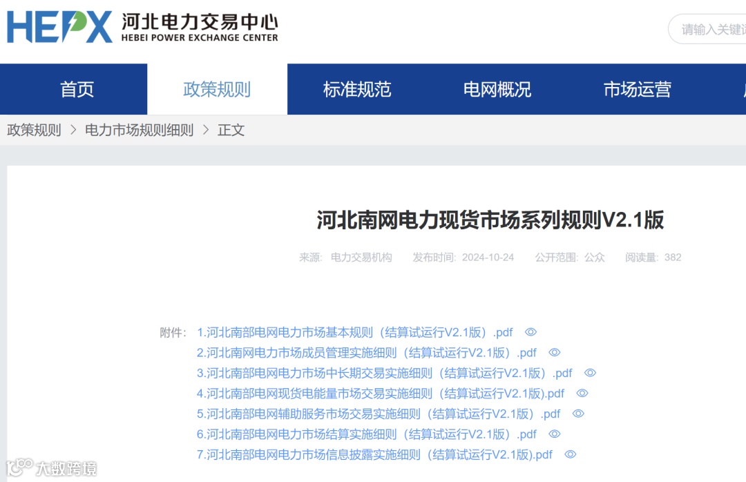 10月24日,河北电力交易中心发布7部电力现货市场系列规则,分别为: