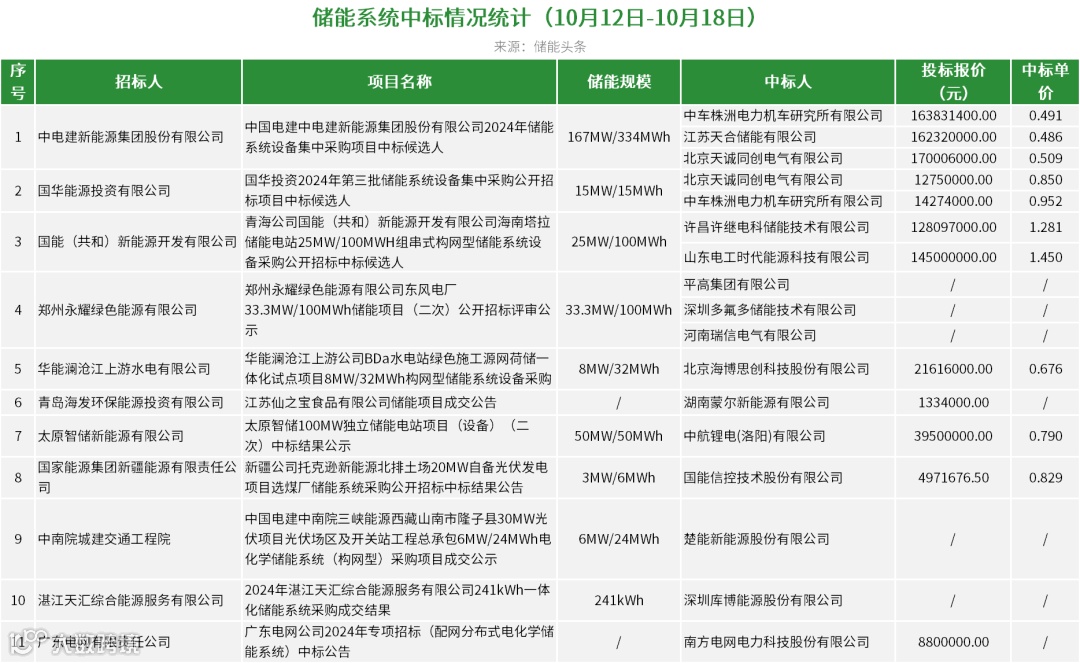 储能系统采购11个项目开标,装机容量为307.3MW/661.241MWh,中标价格落在0.486元/Wh至1.45元/Wh之间,均价为0.831元/Wh。