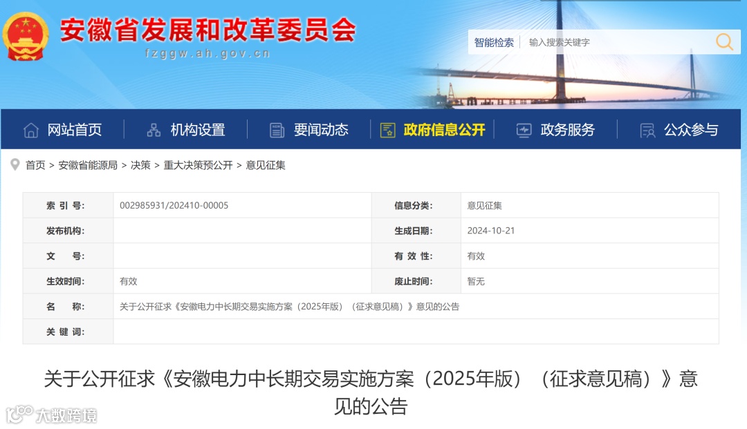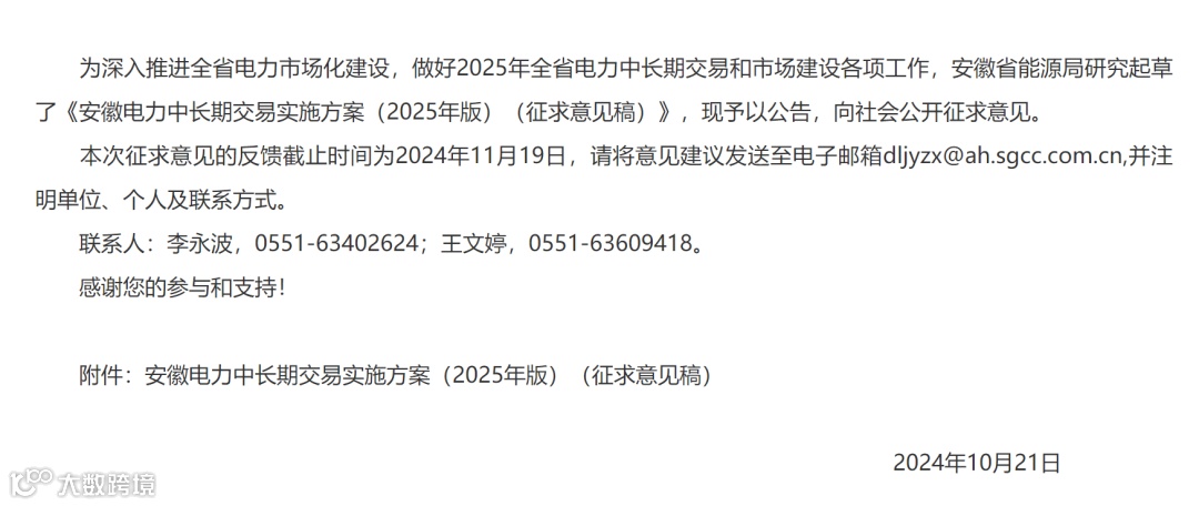 10月21日,安徽省能源局近日发布关于公开征求《安徽电力中长期交易实施方案(2025年版)(征求意见稿)》意见的公告。
