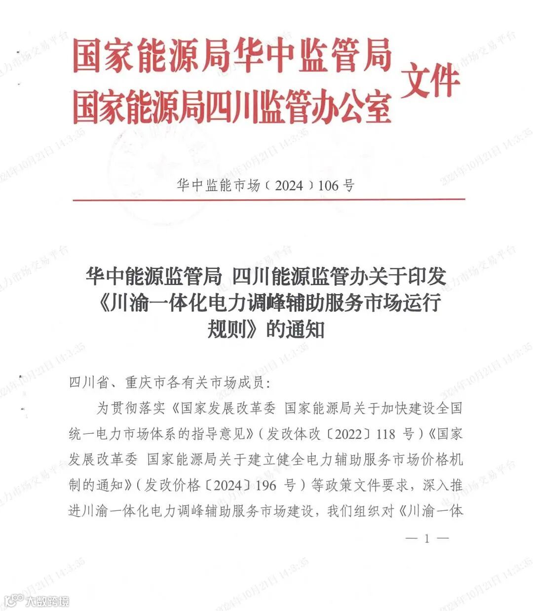 10月18日,重庆电力交易中心发布关于印发《川渝一体化电力调峰辅助服务市场运行规则》的通知,本规则适用于四川、重庆两省市间开展的电力调峰辅助服务。后续待条件成熟,可将西藏电网及相关经营主体纳入到本市场中。