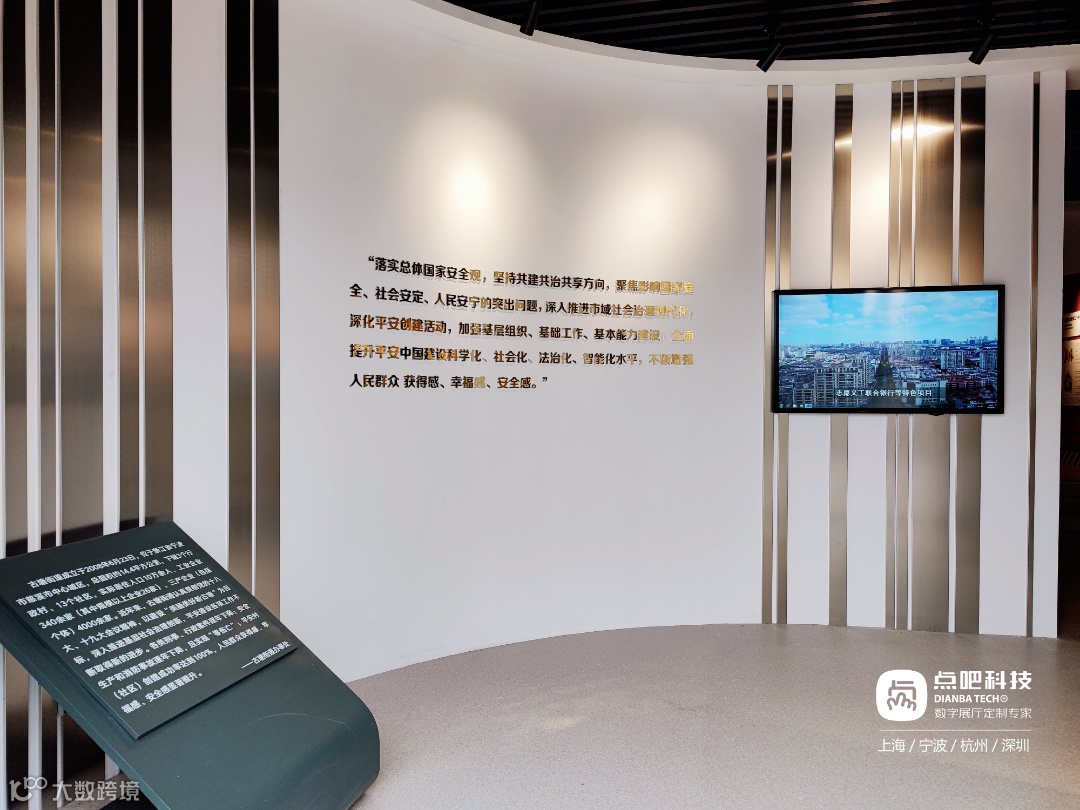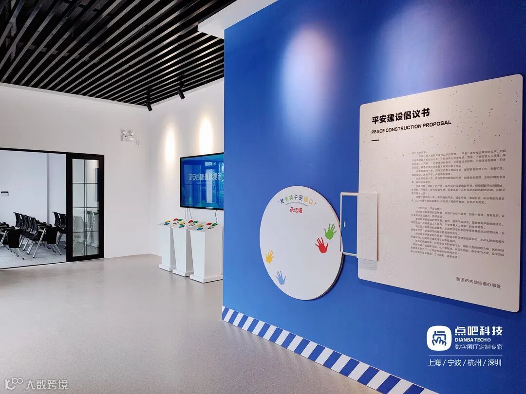 由点吧科技团队承接打造的慈溪市古塘街道平安建设体验馆,以“三知三行·平安古塘”为主题,知安防,知避险,知健康;宣教先行,体验随行,教育同行,将展馆设置为序厅、平安建设宣教体验区、综合宣教培训室、尾厅四个展区,运用数字技术,打造“视觉、听觉、体验”相结合的三维立体参观模式,使学习更具知识性、趣味性、互动性、传播性,为广大群众进一步增强安全意识提供了一个重要学习交流场所。