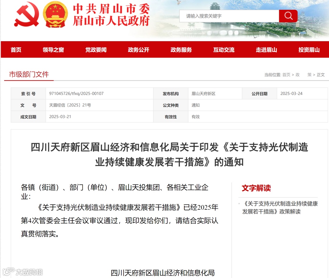 3月21日,四川天府新区眉山经济和信息化局发布关于印发《关于支持光伏制造业持续健康发展若干措施》的通知。