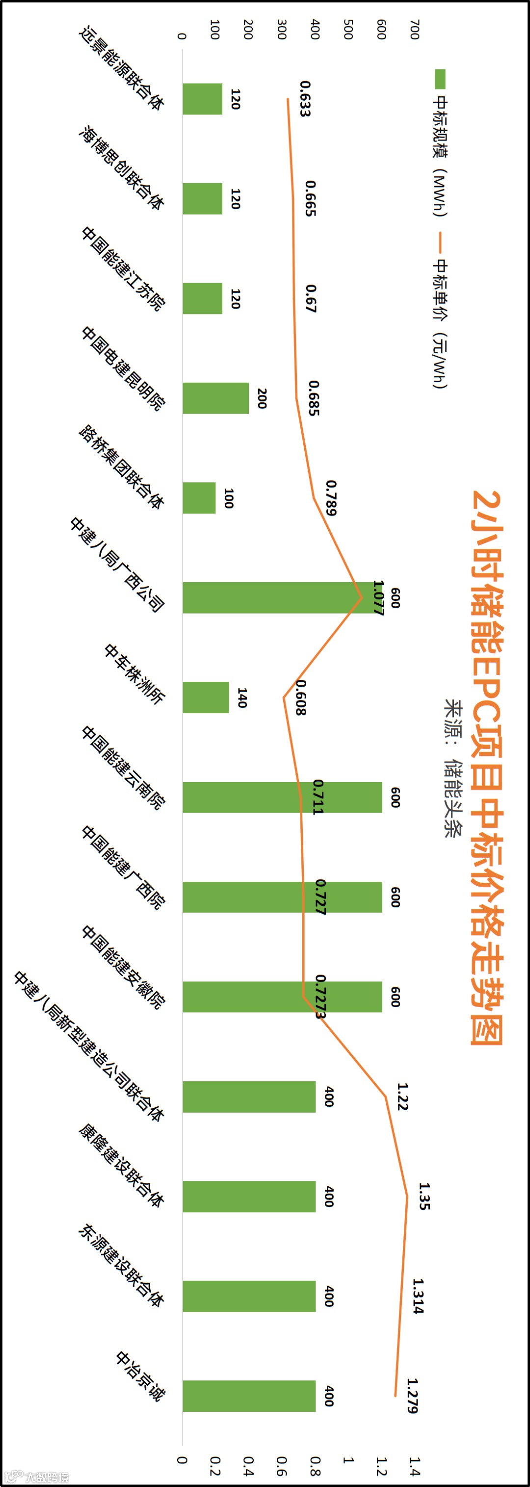 储能EPC的投标报价在0.608到1.35元/Wh之间。