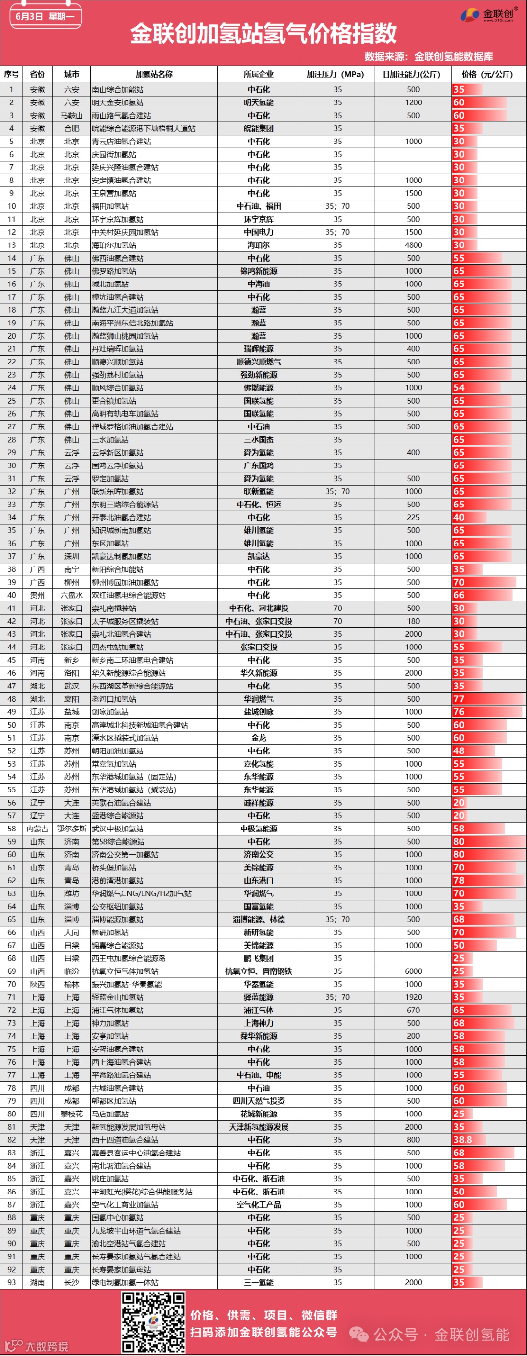 金联创氢能数据库显示,2024年6月3日,全国20省加氢站氢气平均价格51元/公斤,大连加氢站氢气价格最低,为20元/公斤,山东加氢站氢气价格最高,为80元/公斤。