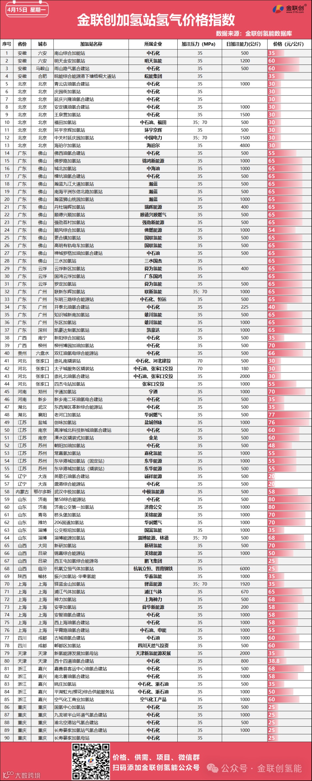 金联创氢能数据库显示,2024年4月15日,全国19省90座加氢站氢气平均价格51元/公斤,大连加氢站氢气价格最低,为20元/公斤,山东加氢站氢气价格最高,为80元/公斤。
