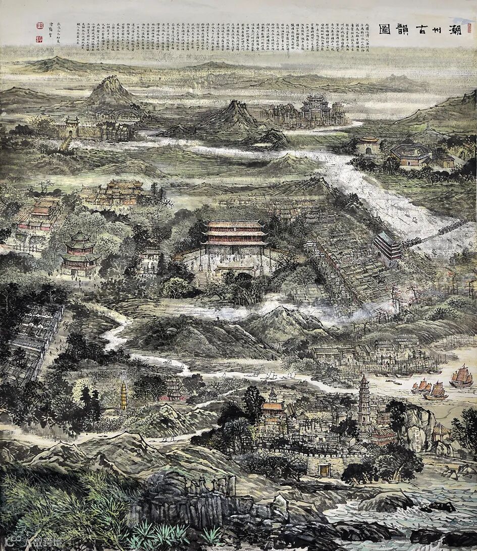 清承明制,潮州府的建制在历史长河中绵延发展,雍正十一年嘉应州设立后,府辖县增至八个,乾隆三年丰顺县设立,最终形成“潮州一府管九县”的格局。这九座县城如同珍珠般散落于粤东大地,承载着潮人共同的文化记忆,成为海内外游子寻根觅祖的精神家园。2025年,第二十三届国际潮团联谊年会将在潮州隆重举办,已落成的潮州国际潮团会展中心及周边配套项目将作为年会会址。如何让这片重点区域既彰显专业气质,又饱含浓郁潮味,让全球潮人在此感受到强烈的归属感与亲切感,成为亟待解决的重要课题。为此,市文联主动肩负起重点场馆大型系列美术作品《归潮》的创作重任,而《潮州古韵图》便是其中最具分量的一幅,它以清代潮州府九县风貌为核心,旨在唤醒全球潮人的故土情怀与乡愁记忆。