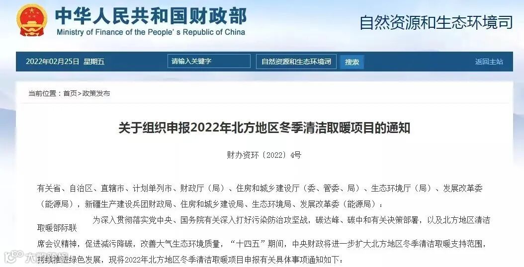 22日,财政部发布《关于组织申报2022年北方地区冬季清洁取暖项目的通知》,组织申报2022年北方地区冬季清洁取暖城市。根据通知内容显示,冬季实行清洁取暖且有改造需求的北方地区地级以上城市(包括新疆生产建设兵团)均可申请纳入支持范围,每省(市、区)限报3个城市。计划单列市可单独报送。已纳入中央财政前四批冬季清洁取暖城市范围的,不得重复申请。
