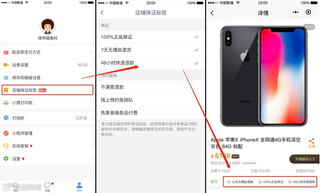 新增了10张轮播商品主图,商户后台和APP均可修改。新增店铺保证标签,如“七天无理由退货”、“100%正品保证”等,需商家在手边APP【我的】-【店铺保证标签】中勾选支持的服务,默认全不勾选。