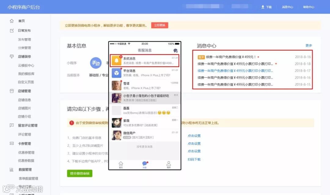后台首页展示“消息中心”模块和手边App系统消息,展示来自运营后台发布的消息。