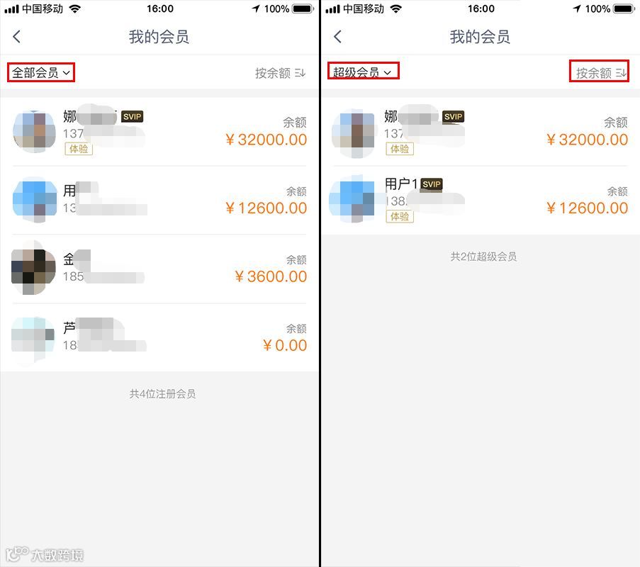 可查看全部会员,也可筛选超级会员,还按照余额、注册时间、名称排序。