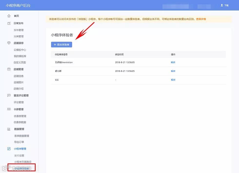 小程序提审前我们想要体验一下功能是否设置好了,就可以使用小程序体验者功能。体验者可以直接预览体验版小程序,扫码体验版二维码。