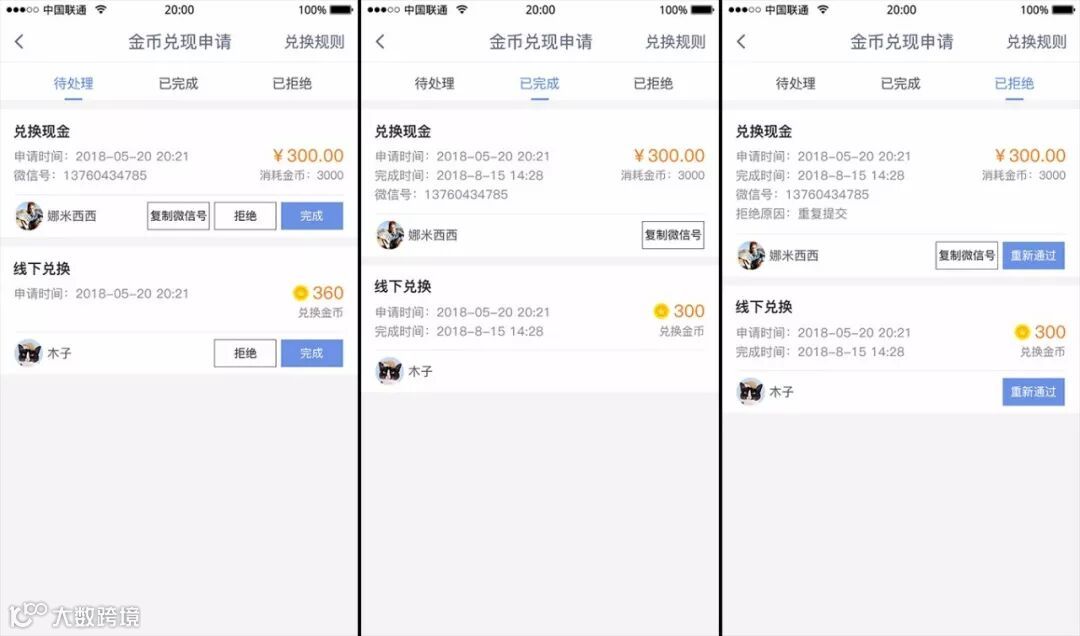 线上兑换需要商户复制微信号并添加用户为微信好友后转账,完成后再回到APP中点击“完成”;线下兑换兑换完成后直接点击“完成”即可;拒绝兑换需要填写拒绝原因。为了店里的声誉,请商家务必给用户进行兑换。