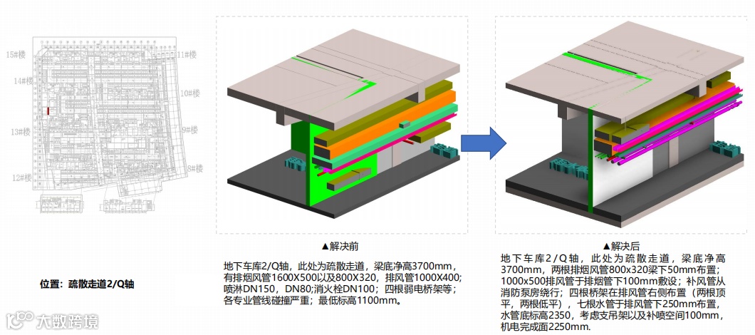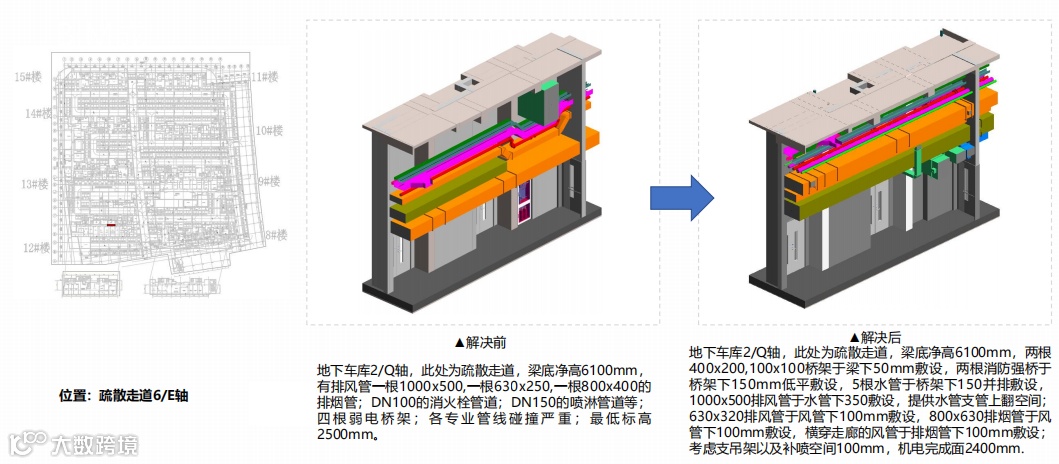 通过BIM三维可视化模拟,将项目完成后管线布置情况以及各区域净高提前进行分析优化,有效避免施工过程中由于净高不足导致的拆改变更。