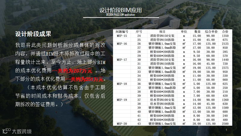 我司将此类问题剖析拆分成具体的拆改内容,并通过BIM技术将拆改过程中的工程量统计出来。至今为止,地上部分BIM的成本优化费用一共约为207万元,地下部分的成本优化费用一共约为251万元。(本成本优化估算不包含由于工期节省的时间成本和财务成本,仅包含后期拆改的签证费用。)