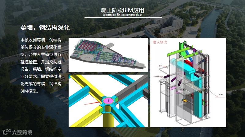 审核收到幕墙、钢结构单位提交的专业深化模型,合并入主模型进行碰撞检查,并提交问题报告。幕墙、钢结构专业分要求:需要提供深化完成的幕墙、钢结构BIM模型。