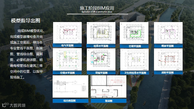 完成BIM模型优化、完成模型碰撞检查并完成施工交底后,导出各专业管线平面图、剖面图、管线综合图、留洞图,必要机房详图,明确每根管线在建筑三维空间中的位置,以指导现场施工。