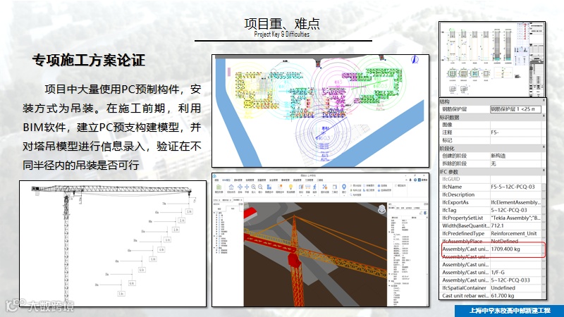 项目中大量使用PC预制构件,安装方式为吊装。在施工前期,利用BIM软件,建立PC预支构建模型,并对塔吊模型进行信息录入,验证在不同半径内的吊装是否可行。