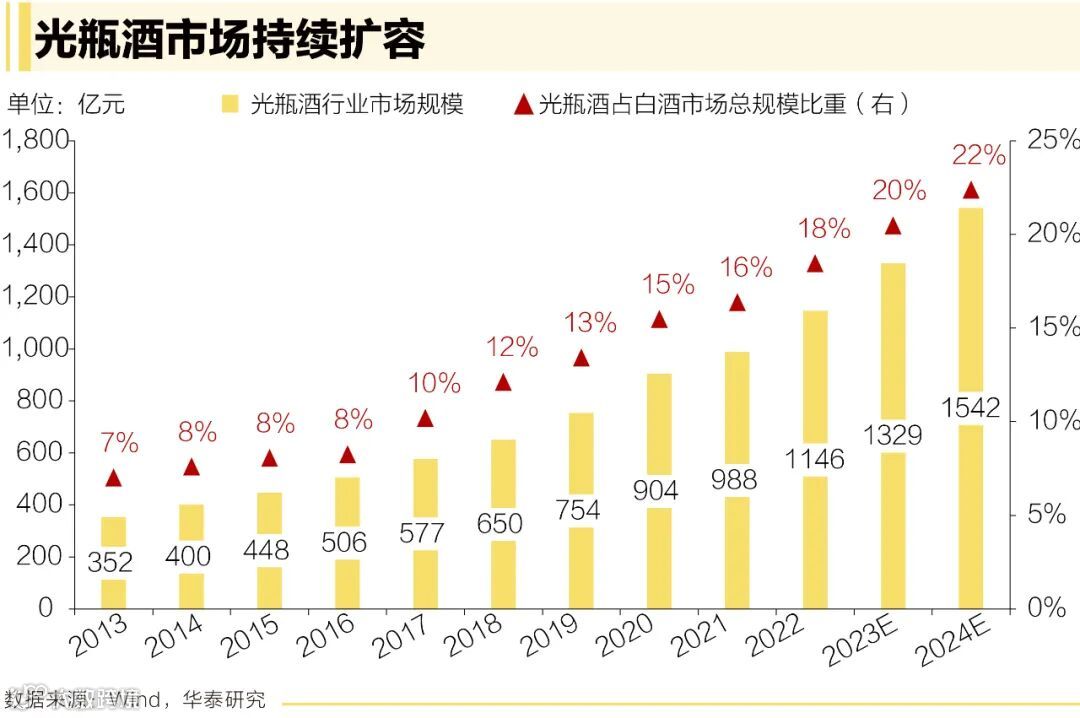 近年来,随着白酒消费者的迭代和人们对于性价比的追求,光瓶酒进入快速发展期,高线光瓶更以其“既有里子,又有面子”的双重特质,抢占了不少市场份额。据中国酒业协会相关数据统计,2023年光瓶酒市场年复合增长率达到14%,预计2024年市场规模将超过1500亿元。