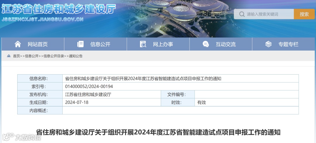为贯彻落实《省政府关于促进全省建筑业高质量发展的意见》(苏政规〔2023〕14号),加快智能建造技术推广应用,推动我省建筑业转型升级和高质量发展,经研究,决定组织开展2024年度江苏省智能建造试点项目申报工作。现将有关事项通知如下: