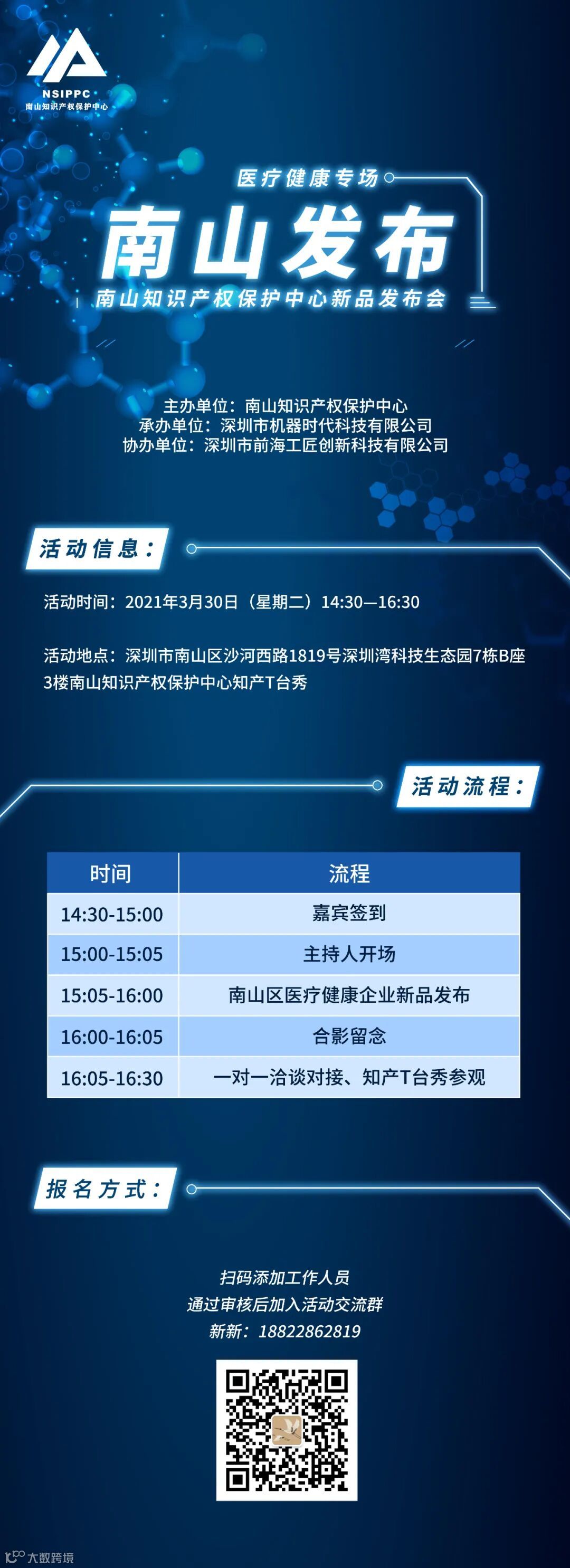 现拟于2021年3月30日星期二14:30—17:30在南山知识产权保护中心知产T台秀举办“南山发布”南山知识产权保护中心新品发布会——医疗健康专场,诚邀前沿科技企业代表出席。