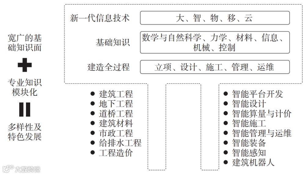 因为智能建造最显著的特征是多学科交叉融合,不仅要求能解决具体工程问题,还要具有 Π 型知识结构。从知识结构看,要求智能建造专业人才具有宽泛的知识面。生物混凝土、智能施工设备、3D打印等土木工程领域新技术,充分体现了生命科学、材料 学、计算机学、机械学等学科与土木工程的交叉融合和未来发展趋势。所以不论是社会人员还是培养人才,从事智能建造行业都需要了解交叉学科的基础知识和 基本理论。智能建造专业的各学科交叉融合要求做到的是融会贯通、有机融合,而不是简单的填鸭式堆砌。同时,智能建造专业人才知识结构也需要解决 Π 型中竖的问题,即需要具备对工程管理、土木工程等某 一基础学科足够深入的专业知识。智能建造专业的培养模式需要着手于学科交叉融合,在土木工程基础上融合云计算、区块链、BIM技术等综合多学科技术的新体系。为构建各学科交融的新体系,首先应以满足社会需要、符合建筑行业发 展趋势为人才培养目标,明确其在技术、管理、造价、信息、法律等不同领域都具备一定程度的能力,以此构建目标框架体系,将目标、课程、能力三者有机统 一。形成通识教育 + 专业教育 + 素质教育的三位一体培养模式。