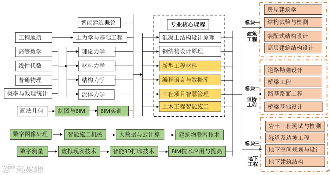 北京建筑大学在传统土木工程专业中所包含的高等数学、线性代数、工程地质和画法几何等通识教育与理论力学、材料力学、结构力学等基础力学课程的基础上,还增加或调整了智能建造概论、编程语言与 数据库、大数据与云计算、数字测量、新型工程材料、 土木工程智能施工、工程项目智慧管理等理论课程。