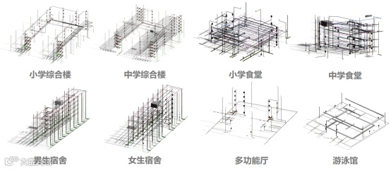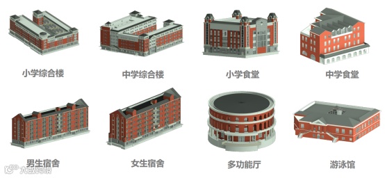 规划根据功能配置对场地进行结构分区,共分为小学教学区、中学教学区、后勤服务区、设施共用区及课外运动区,包括多功能厅、中学食堂、小学食堂、中学综合楼、小学综合楼、宿舍、游泳馆、中学运动场地、小学运动场地等。
