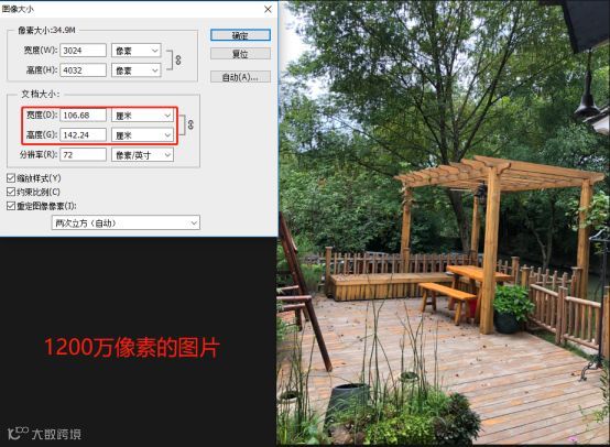上图是在Photoshop里处理的同一张图片,在分辨率相同的前提下,800万像素的图片尺寸是86cm*115cm;1200万像素的图片尺寸是106cm*142cm。就是说同样清晰度下,200万像素的图片能更大。