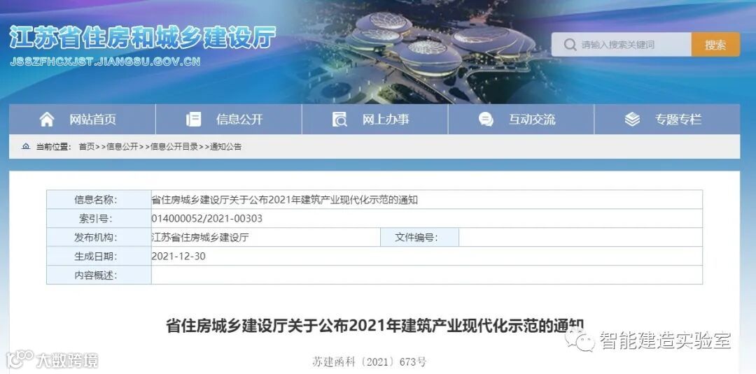 根据《省住房城乡建设厅关于组织申报2020年度省级建筑产业现代化示范(第二批)的通知》(苏建函科〔2020〕588号)、《省住房城乡建设厅关于组织申报2021 年省级建筑产业现代化示范的通知》(苏建科〔2021〕135号),经材料初审、现场踏勘、专家评议、综合审定等程序,确定装配式建筑示范工程46个、装配化装修示范工程4个、BIM技术应用示范工程16个、市政、村镇、园林等建设领域示范工程7个、示范园区1个、示范基地26个、新型建筑工业化创新基地16个(详见附件),现予以公布。