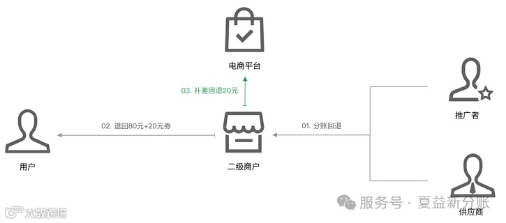● 平台可从二级商户账户退回80元给到用户,并通过补差回退将20元部分或全部退回到平台。