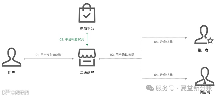 开展由平台出资的营销活动时,支持平台补差转账给二级商户。场景举例如下:
