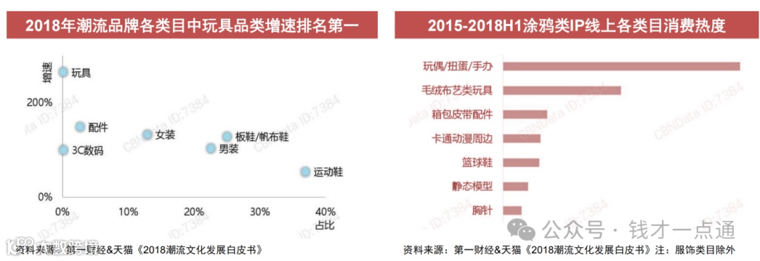 潮流玩具增速领跑各类潮品。根据第一财经&天猫《2018潮流文化发展白皮书》数据,在 潮流品牌细分市场中,虽然玩具品类规模占比较小,但是以接近300%的增速领跑鞋帽等 各类潮品。此外,根据第一财经&天猫《2018潮流文化发展白皮书》数据,近三年来涂鸦 类IP在玩偶/扭蛋/手办品类的热度也领跑毛绒玩具、箱包皮带等品类,展现出潮流玩具有 强大的消费号召力与影响力。