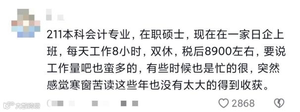 “211本科会计专业,在职硕士,现在在一家日企上班,每天工作8小时,双休,税后工资8900左右。”