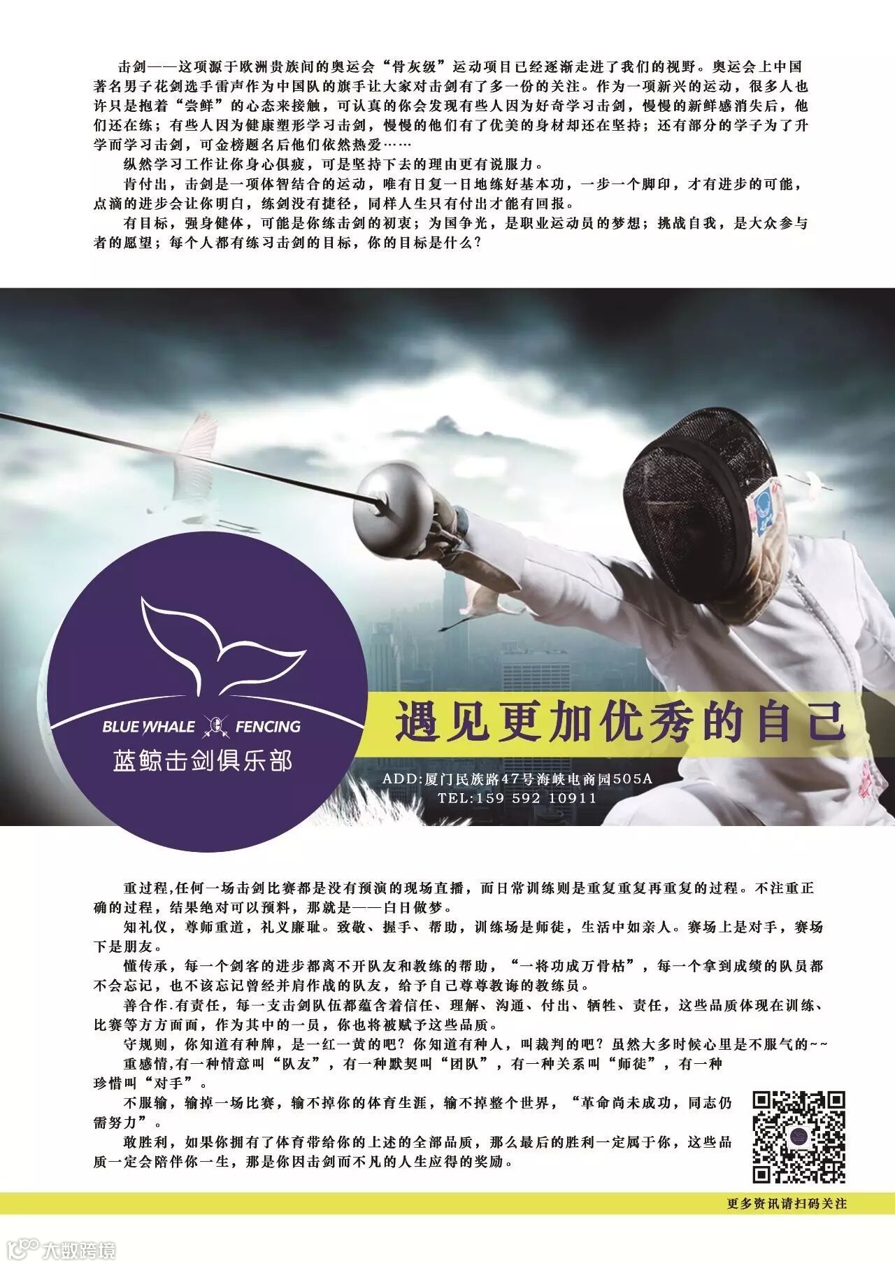 蓝鲸击剑俱乐部——2016年孕育而生,地处厦门美丽的演武大桥畔的民族路海峡电商园内。蓝鲸击剑俱乐部作为厦门首批正式的中国击剑俱乐部协会成员单位,拥有近千平专业的训练比赛场地,承袭福建击剑优势,拥有专业的教练团队。蓝鲸击剑俱乐部致力于击剑运动的推广,专注4岁以上儿童及成人的击剑培训,蓝鲸击剑俱乐部定期参加中国击剑俱乐部联赛,海外交流赛等,希望通过在蓝鲸击剑的学习,在每一个孩子的心中种下对击剑这项运动热爱的种子!