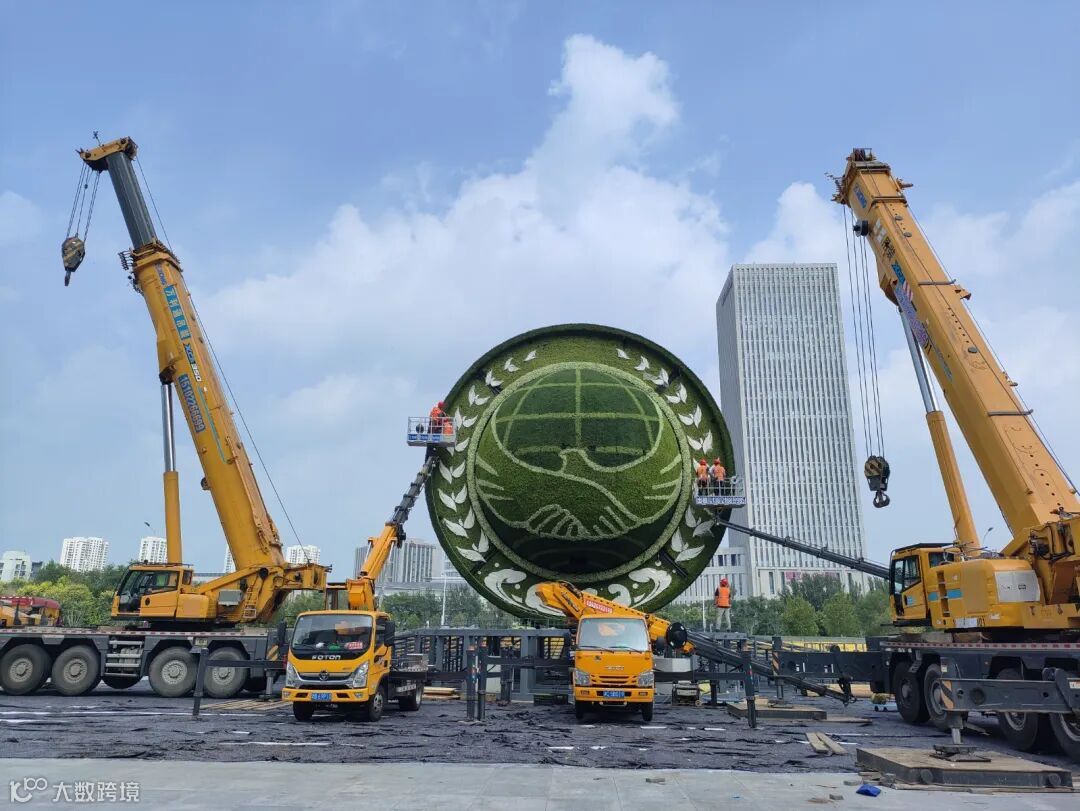 在梅江会展中心广场,一座上合峰会主题标识立体造型格外醒目,这也是目前可查的国内最高的立体园艺花坛,其核心建设任务由泰达园艺全程主导施工。据了解,该造型以“合作·共赢”为主题,暗藏多种设计巧思:主体采用黄绿两色的五色草、金叶佛甲草构建,交织的“双手”形似和平鸽,象征文明交汇融合;边缘抽象的装饰图案远观如生长的树叶,近看似灵动飞鸟,寓意不同文明在这里汇聚,展现多元、开放、包容的国家胸怀;深绿与浅绿色调在白色线条勾勒下,让合作共赢理念直观可感。